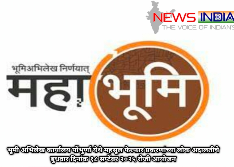 त्याअनुषंगाने उप अधीक्षक भूमी अभिलेख पोंभुर्णा श्री अरुण वऱ्हाडे यांनी दिनांक १८ सप्टेंबर २०२५ रोजी फेरफार प्रकरणांच्या लोक अदालतीचे उप अधीक्षक भूमी अभिलेख कार्यालय पोंभुर्णा येथे ११.०० वाजता आयोजन केले आहे.फेरफार प्रकरण लोक अदालती मध्ये निकाली काढली जाणार असल्यामुळे जनतेनी ज्यास्त ज्यास्त फायदा घ्यावा असे आवाहन उप अधीक्षक भूमी अभिलेख पोंभूर्णा श्री अरुण वऱ्हाडे कळवितात.