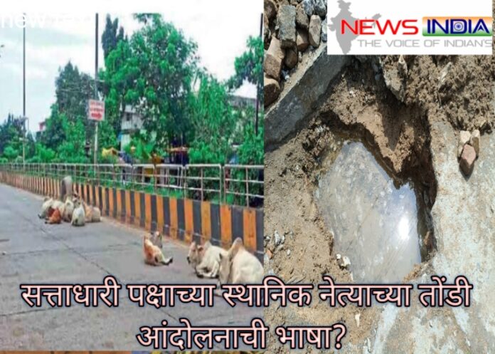राष्ट्रीय महामार्गावर ठाण मांडून बसायला लागलीत. विदारक चित्र आहे, अनेक समस्यांना वाव देणारी ही बाब आहे. मोकाट जनावरांचे साऱ्याच रस्त्यांवर निर्वासित होणे ही बाब क्षेत्राचे आमदार सुधिरभाऊ मुनगंटीवार व सत्ताधारी भा. ज. पा. च्या ‘ स्माटॅ सिटी’ या संकल्पनेला तडा देणारी बाब ठरते. मागणी एकदम रास्त अन जनहिताची असली तरी सत्ताधारी पक्षाच्या स्थानिक नेत्यांनीच आंदोलनाचा ईशारा देणे हा प्रकार आपले अंतॅवस्त्र आपणच फाडणे यात मोडणार नाही का? हा सवाल