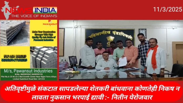 अतिवृष्टीमुळे संकटात सापडलेल्या शेतकरी बांधवाना कोणतेही निकष न लावता नुकसान भरपाई द्यावी :- नितीन येरोजवार