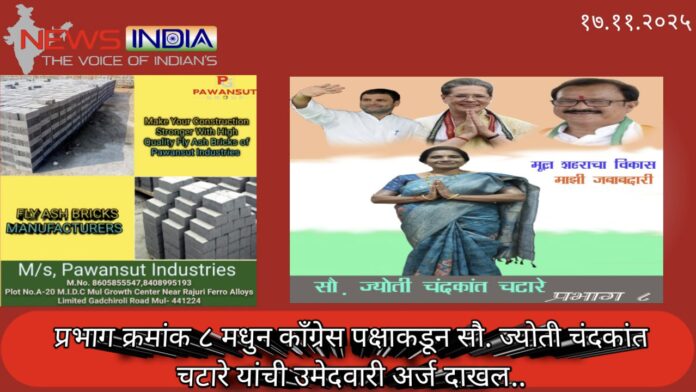 मुल: मुल नगरपरिषद सार्वत्रिक निवडणूकीत साठी प्रभाग क्रमांक ८ मधुन काँग्रेस पक्षाकडून सौ ज्योती चंद्रकांत चटारे यांनी उमेदवारी अर्ज दाखल केला असुन त्या युवा शक्ती व्यायाम मंडळ येथे महिला मंडळाच्या वतीने आयोजित करण्यात आलेल्या क्रिडा मंडळ स्पर्धा येथे नेहमी सहभागी असतात व स्वता कबड्डी खेळाडू आहेत व शांत स्वभाव स्वयमी, नेहमी सामाजिक कार्यात व संघटनेच्या माध्यमातून अनेक सामाजिक काम करणारे म्हणून त्यांची ओळख आहे तसेच उच्च शिक्षीत म्हणून सुद्धा त्यांची ओळख आहे चंदकांत चटारे हे माजी उपनगराध्यक्ष होते त्यामुळे त्यांना राजकीय अनुभव दांडगा अनुभव असल्याने त्यांना ह्या नगरपरिषद निवडणूक मध्ये फायदा होईल हे जनतेचे मत आहे, आणि त्या मूळ मुल रहिवासी असलेल्या त्यांची नाळ जनतेची जोडलेली आहे,त्यांचे उमेदवारी साठी अर्ज दाखल होताच प्रभाग क्रमांक ८ मधुन काँग्रेस पक्षाकडून उमेदवारी मिळण्यानी त्यांची बाजू जमेची असल्याचे जनतेमध्ये चर्चा असल्याचि दिसून येत आहे हे विशेष.