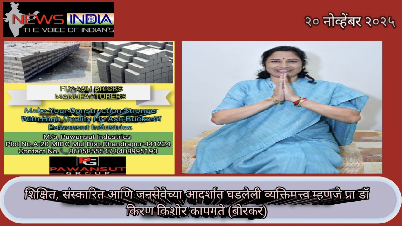 मूल नगरपरिषद निवडणूक 2025 च्या पार्श्वभूमीवर विकास पुरुष आमदार सुधीर भाऊ मुनगंटीवार यांच्या मार्गदर्शनात भारतीय जनता पक्षाने नगराध्यक्षपदासाठी प्रा.डॉ. किरण किशोर कापगते (बोरकर) यांच्यावर विश्वास दाखवत अधिकृत उमेदवार म्हणून जाहीर केले आहे. शिक्षण, संस्कार आणि सामाजिक बांधिलकी असलेली ही उमेदवार लहानपणापासूनच सामाजिक कार्यात अग्रणी होती.समाजाभिमुख कार्य करण्याची प्रेरणा त्यांना त्यांच्या कुटुंबाकडूनच मिळाली असून, सुशिक्षित व संवेदनशील अशा वातावरणात वाढ झाल्याने जनसेवेची ज्योत बालपणातच प्रज्वलित झाली. महिला सशक्तीकरणाला आयुष्यभर वाहिलेल्या प्रा. डॉ. किरण कापगते या *ज्ञान*, *संस्कार* आणि *नेतृत्वाची* विलक्षण सांगड आहेत.समाजातील प्रत्येक महिलेला उभारी देण्यासाठी त्या सातत्याने प्रेरणादायी कार्य करत आल्या आहेत.शिक्षणाच्या बळावर *महिलांना स्वावलंबी* करण्याची त्यांची तळमळ आज अनेकांसाठी दीपस्तंभ ठरली आहे.आपल्या कर्तृत्वाने आणि *संवेदनशील नेतृत्वाने* त्या महिला विकासाच्या दिशेने नवा मार्ग दाखवत आहेत. *सबलीकरण* हे केवळ शब्द नसून, त्या प्रत्यक्ष कृतीतून महिलांसाठी सामर्थ्य निर्माण करणाऱ्या खऱ्या प्रेरणास्त्रोत आहेत.