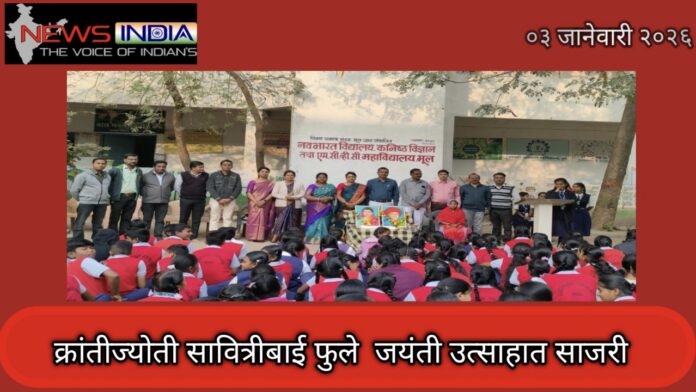 मूल:- 3 जानेवारी 2025 रोजी शिक्षण प्रसारक मंडळ संचालित नवभारत विद्यालय मुल येथे क्रांतीज्योती सावित्रीबाई फुले यांची जयंती साजरी करण्यात आली. कार्यक्रमाचे अध्यक्ष विद्यालयाचे मुख्याध्यापक अशोकराव झाडे तसेच प्रमुख अतिथी म्हणून विद्यालयाच्या पर्यवेक्षिका सौ वर्षा भांडारकर, ज्येष्ठ शिक्षक गुरुदास चौधरी , ज्येष्ठ शिक्षिका कु. प्रतिमा उमक , कु.दीपा गोंगल , कु.माधुरी तलांडे तसेच सर्व शिक्षक उपस्थित होते.कार्यक्रमाच्या सुरुवातीला क्रांतीज्योती सावित्रीबाई फुले आणि क्रांतीसुर्य महात्मा ज्योतिबा फुले यांच्या प्रतिमेचे पूजन तथा दीपप्रज्वलन शाळेचे मुख्याध्यापक तसेच सर्व शिक्षक वृंद यांच्या हस्ते करण्यात आले. त्यानंतर विद्यार्थीनी सुंदर सुमधुर आवाजात स्वागत गीत सादर केले. सर्व शिक्षकवृंदाचे विद्यार्थ्यांनी पुष्पगुच्छ देऊन आनंददाही वातावरणात स्वागत केले.